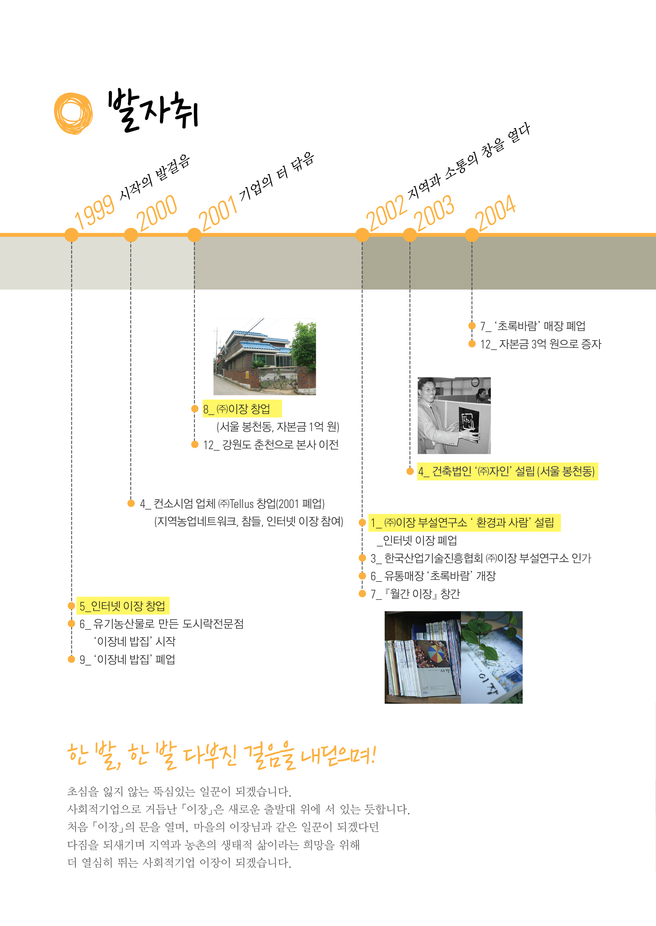 2000년 생태적 삶을 지향하는 회사, 일과 삶이 하나가 되는 회사로 강원도 춘천에서 시작한 주식회사 이장의 가치를 전라북도 완주군 고산에서 협동조합 이장으로 이어갑니다.
