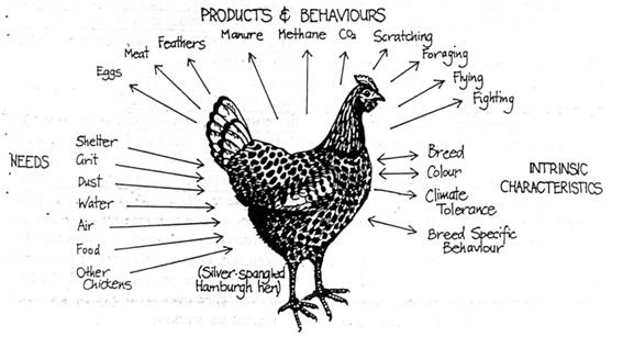 농장에 필요한 요소들이 적절한 위치에 자리 잡으려면 이 요소에 필요한 것과 이 요소로부터 생산되는 것, 요소의 기본적인 특성을 잘 알고 있어야 한다. 이를 요소분석이라 한다. 예를 들어 닭을 대상으로 요소분석을 하면 아래와 같다.